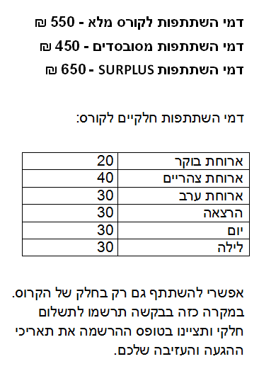 אנו מארגנים 3 ארוחות ביום ומשתתפים בהכנתן. הארוחות כלולות בדמי השתתפות.